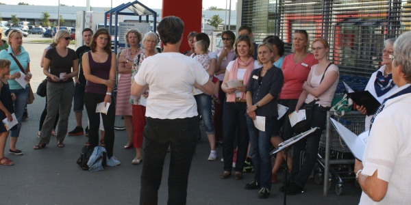 | Ein bundesweit tätiger Drogeriemarkt feiert sein 40-jähriges Firmenjubiläum und hatte in 1450 Märkten zum Singen und Mitsingen eingeladen, so auch den Preetzer Gesangverein in die Filiale in Schwentinental. Dort sang der Gemischte Chor für das benachbarte "Nordeutsche Epilepsiezentrum für Kinder und Jugendliche", das vom DRK-Landesverband getragen wird. Die verteilten Liederzettel trugen dazu bei, dass Kundinnen und Kunden stimmgewaltig die Weise "Freude schöner Götterfunken" von Ludwig van Beethoven mitsangen, aber auch "Die Gedanken sind frei" und "Froh zu sein bedarf es wenig" war in der offiziellen Auswahl enthalten und wurde fröhlich in der Gemeinschaft gesungen. Mit einigen Chorsätzen rundeten die Preetzer Sängerinnen und Sänger das Programm ab, dass am kommenden Sonnabend (31.8.13.) um 15.00 Uhr an gleicher Stelle wiederholt wird. Eine besondere Idee des Unternehmens, das damit anlässlich des Jubiläums insgesamt 2.200 soziale Projekte in Deutschland unterstützt. |