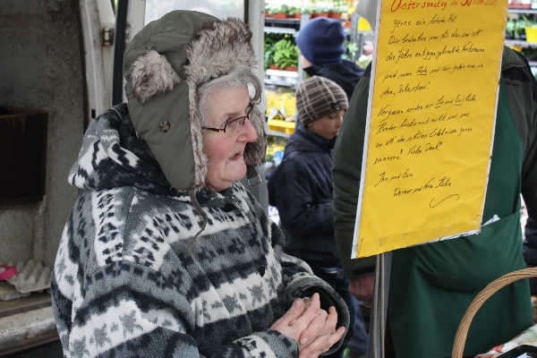 | Frage: Warum trafen sich Sängerinnen und Sänger des Preetzer Gesangvereins am Vormittag des 30. März auf dem Wochenmarkt? Antwort: Nach fast 19 Jahren sagten Vera und Werner Kohn am Ostersamstag dem Wochenmarkt in Preetz "Ade"! Die zahlreichen Stammkunden bedauern die Entscheidung des Ehepaares und kamen mit kleinen Aufmerksamkeiten ein letztes Mal an den Stand, um Landeier, Obst, Gemüse und Kartoffeln einzukaufen, sich zu verabschieden und "Alles Gute" zu wünschen. | |||||||