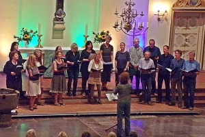 | Zum Abschluss des Konzertes erklang das von allen Sängerinnen und Sängern gemeinsam gesungene "Evening rise" unter dem Dirigat von Carl-Walter Petersen (Bild unten). Die Kieler Nachrichten veröffentlichte am 12.9.2016 einen großen Bildbericht über die Veranstaltung des Fördervereins unter der Überschrift "Musikalische Hilfe für den Wetterhahn". Darüber freuten sich alle Beteiligten. Der Einsatz für die gute Sache hat sich gelohnt! | |||||